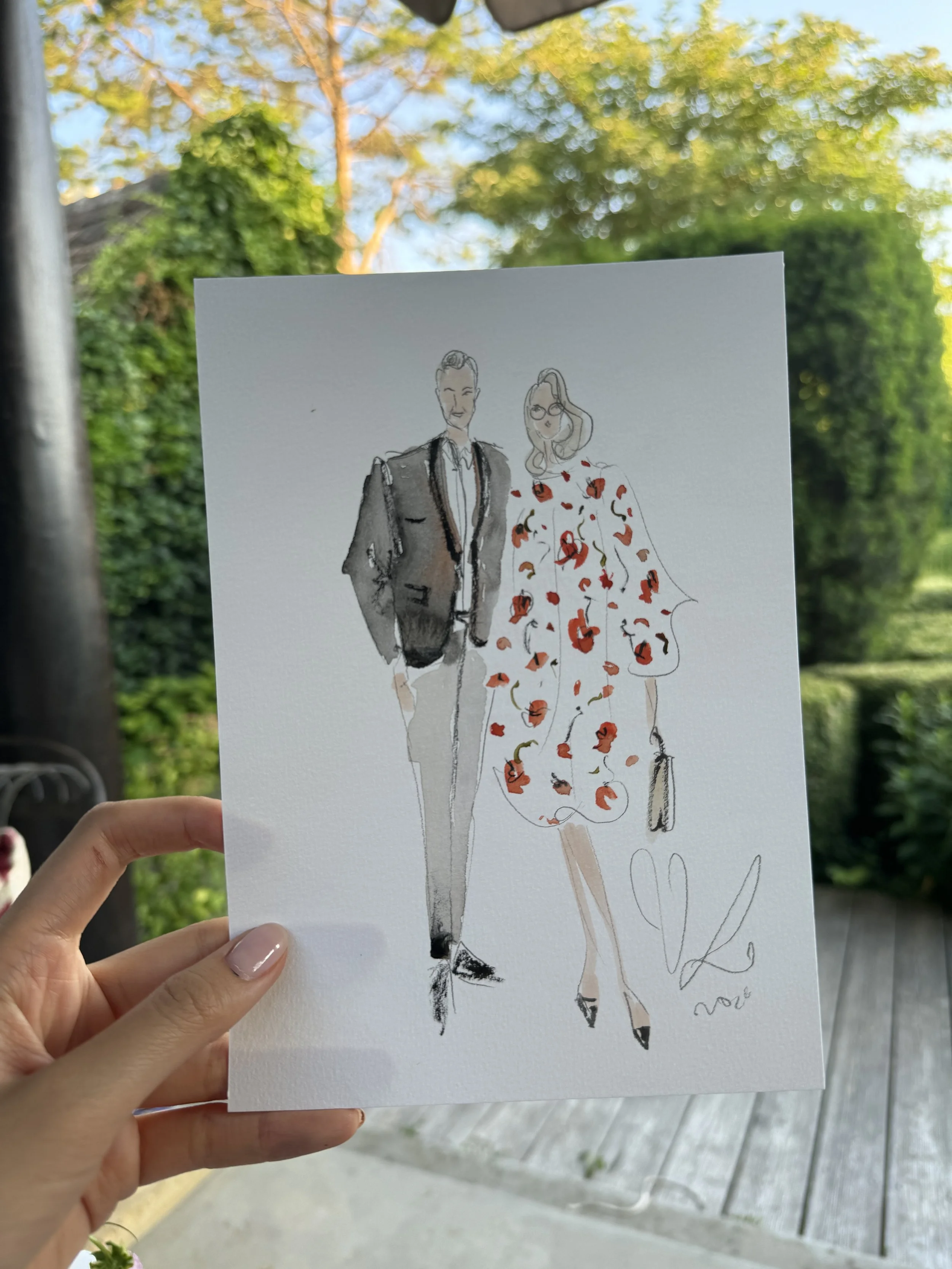 My illustrations capture guests in a bold, elegant style inspired by high-fashion sketches. Working with smooth, expressive watercolour brushstrokes, I portray each guest naturally - no need for posing. Instead, I interpret their essence through my artistic lens, transforming them into sophisticated works of art.
